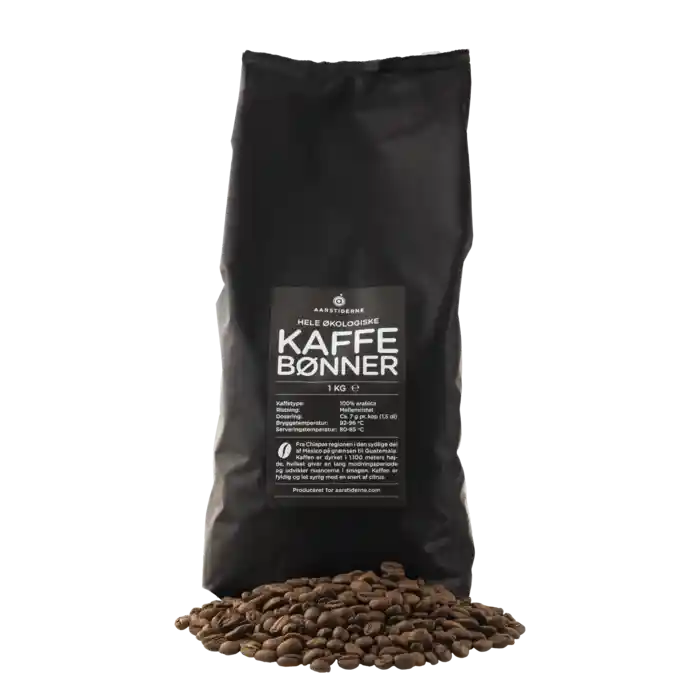 Aarstidernes økologiske kaffebønner i pose, 1 kg i alt.
