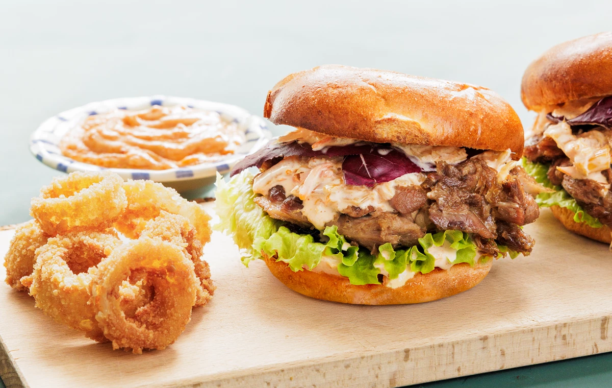 Denne saftige og smagfulde luksusburger giver nyt liv til mørt andekød, som kombineres med spicy kimchi-mayo og hjemmelavede løgringe med røget chipotle-mayo.