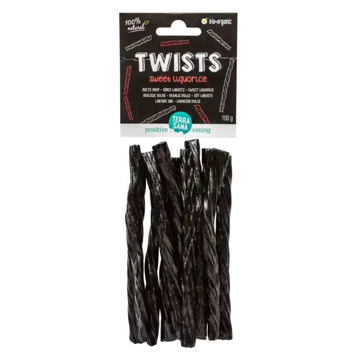 Økologiske lakrids-'twists' fra TerraSana, 10 stk., 100 g i alt.