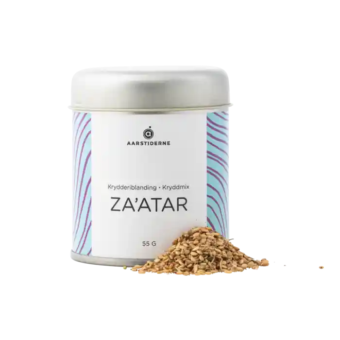 Vores za'atar består af merian, timian, oregano, salt, sesamfrø og sumak. Den smager både salt, surt, tørt og krydret – og en lille smule af nødder. Derfor bruges za'ataren ikke bare som appetitvækker, men også som krydderi på fisk og grøntsager.