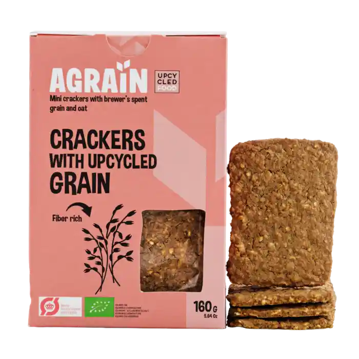 Agrain er et nyt dansk fødevarebrand. Agrain fik luft under vingerne, da to universitetsstuderende i 2018 fik idéen om at "upcycle" mask til fødevarer.