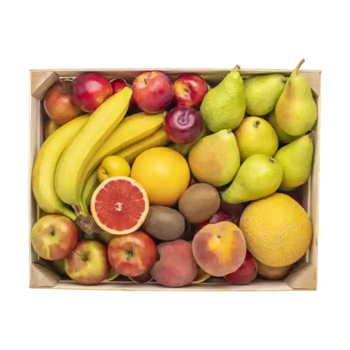 Kassen indeholder en blanding af almindelig håndfrugt, som fx bananer, æbler, appelsiner og pærer, og eksotisk frugt i sæson, som fx melon, mango, vindruer, kiwi og indimellem abrikoser, kirsebær mm.