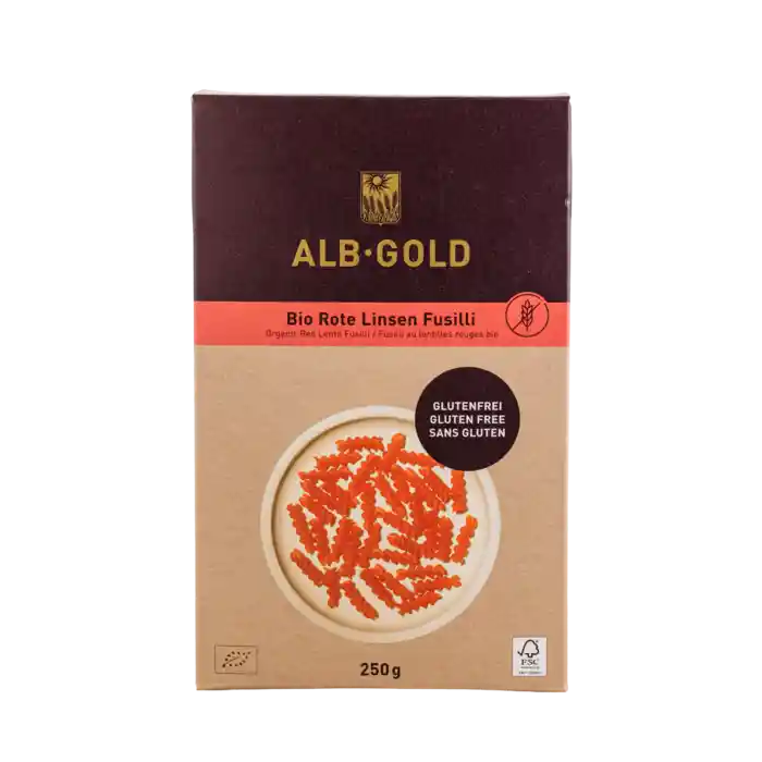 Økologisk glutenfri pasta fusili med rød linseml, fra ALB GOLD, 250 g.