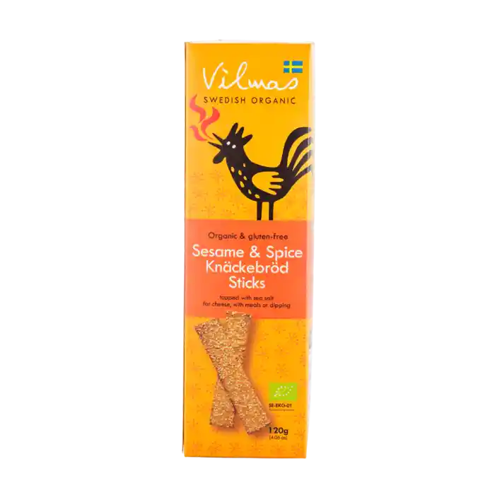 Sprøde, økologiske og glutenfri knækbrødsticks bagt med havre, boghvede og sesamfrø. Smagt til med mild chili, ristet hvidløg og krydderier, som giver en mild varme og nøddeagtig smag.