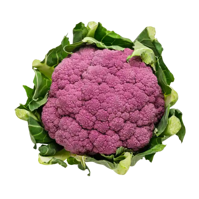 En violet variant af det mere almindelige hvide blomkålshoved. Den violette farve kommer naturligt fra anthocyaniner – de samme farvestoffer, som også er på spil i rødkål og hindbær. Et friskkogt blomkålshoved, der ikke er sønderkogt, smager dejligt. Bare giv det en let tur i saltet vand, der ligger lige under kogepunktet.