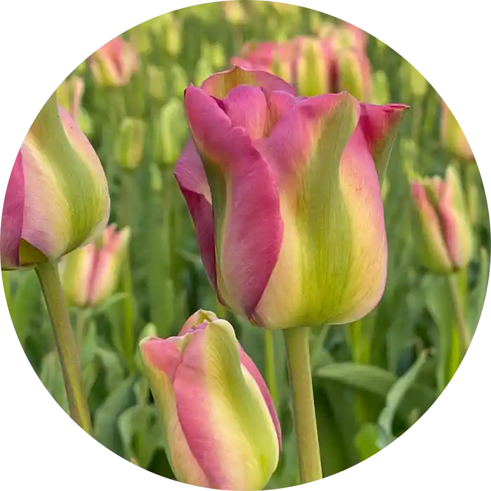 Groenland kan changere fra næsten elfenbenshvid, til sartrosa og til pink - dog altid med lysegrønne "flammer" op ad kronbladene. Groenland er en viridiflora-type. Sæt blomsterløgene i efteråret, og lad tulipanerne pryde din have til foråret.
