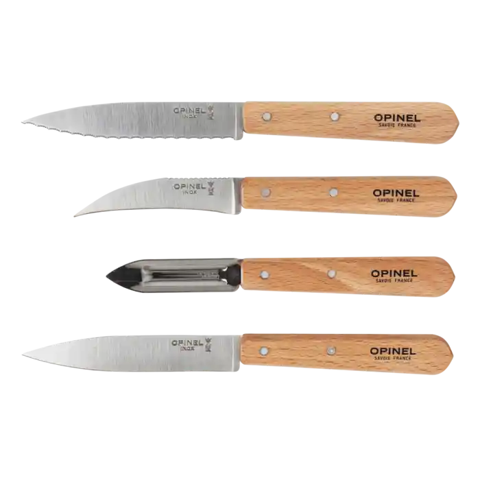 Sæt med 4 forskellige knive i rustfrit stål og håndtag af bøg fra franske Opinel.