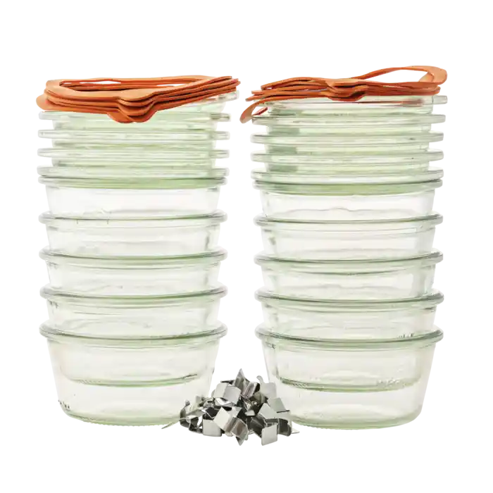 Weck-glas med tilhørende låg, gummiring og klemmer, 290 ml., 10 sæt i alt.