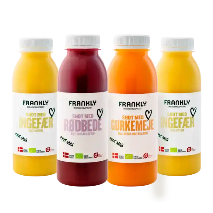 Frankly er en af vores helt særlige leverandører og samarbejdspartnere. Vi leverer nemlig råvarer til dem, som de presser og hælder på flasker, sådan at I kan drikke friskpresset juice af økologiske frugter og grøntsager.
