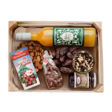Kasse med 9 varer | Håndpakket gavekasse med lækre varer og søde sager