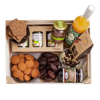 Blandet kasse med 7 varer | Håndpakket gavekasse med lækre varer og søde sager