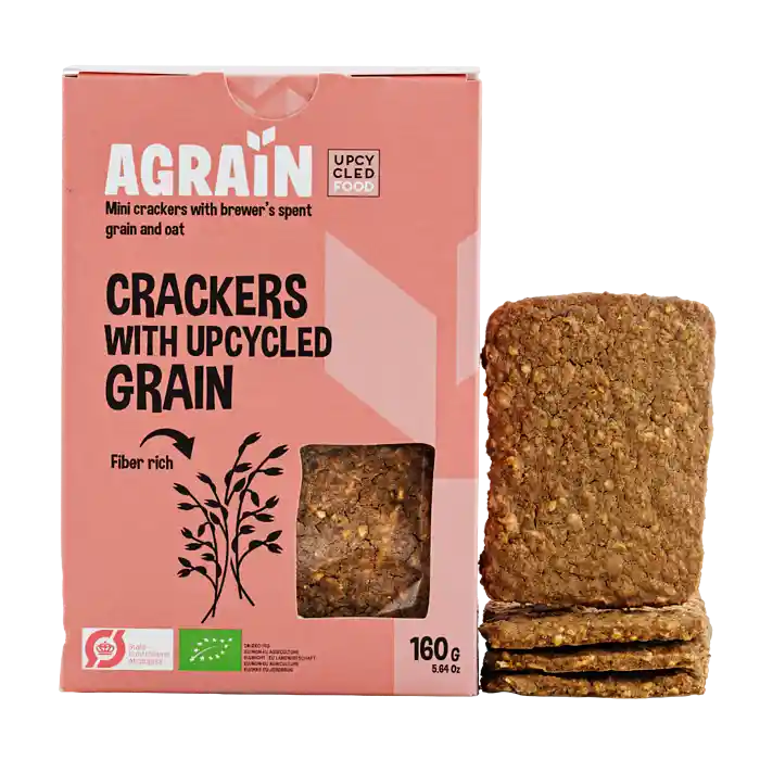 Agrain er et nyt dansk fødevarebrand. Agrain fik luft under vingerne, da to universitetsstuderende i 2018 fik idéen om at "upcycle" mask til fødevarer.