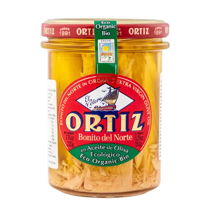 Bonito-tun af højeste kvalitet i økologisk olivenolie fra Conservas Ortiz, 220 g, drænet vægt 150 g.