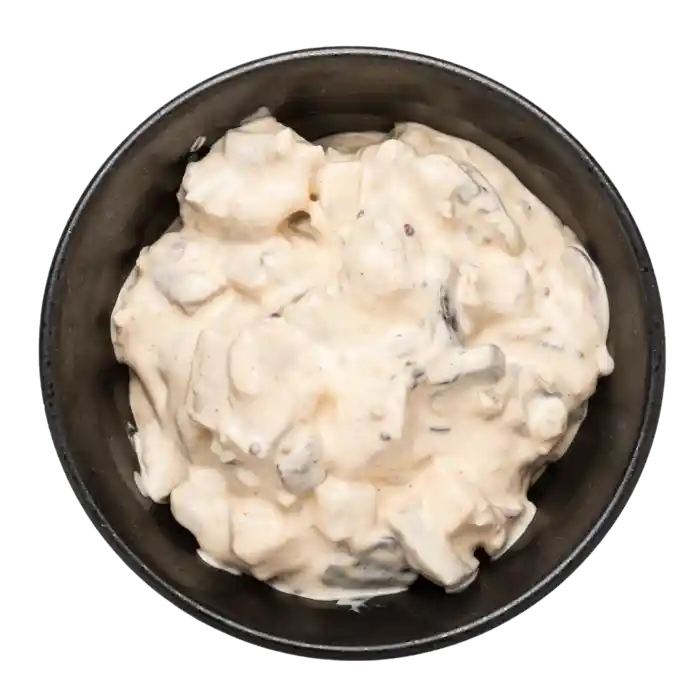Ekstra cremet og fyldig hønsesalat af håndplukket kylling i en dressing af hjemmerørt mayonnaise, grov sennep og creme fraiche tilsat stegte champignoner, selleri og syltede agurker.