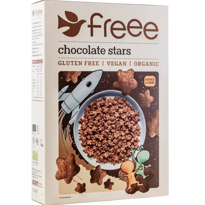 Sprøde chokoldestjerner af majs, ris og chokolade. Morgenmadsproduktet er vegansk og naturligt fri for gluten, æg, mælk, nødder og hvede.