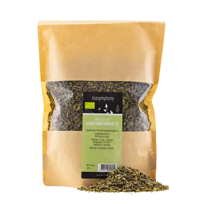 Frisk og kraftig kinesisk te med en let røget smag. Gunpowder-te er berømt for sine små, kugleformede blade, der opnås ved at dampe og forme de friske teblade til små perler. Perlerne folder sig ud under brygning.