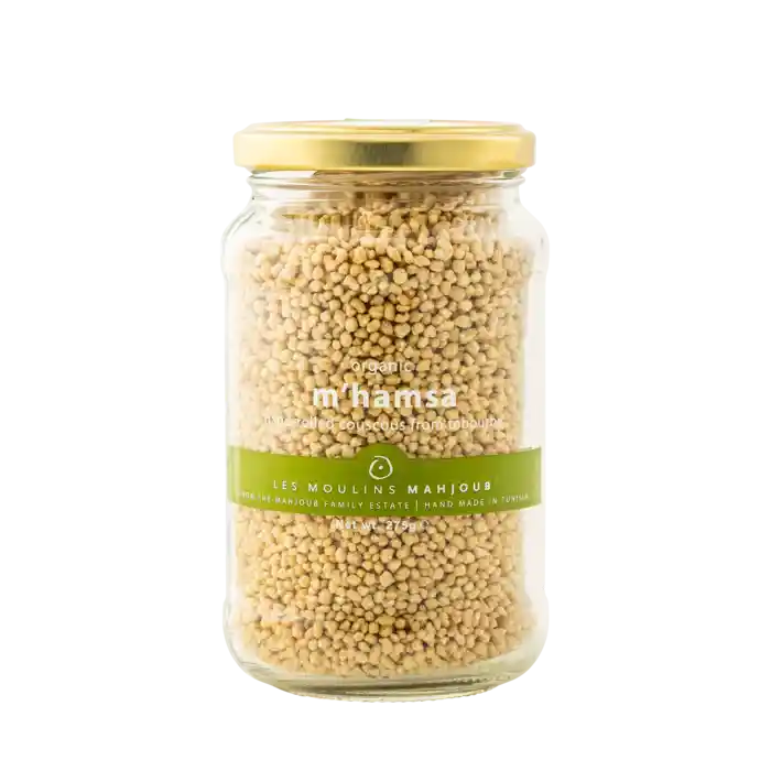 M'hamsa couscous adskiller sig fra den mere almindelige, fintkornede variant. Den har større, perlelignende runde korn, der giver en mere fast og tyggevenlig tekstur. M'hamsa couscous er lavet af durum hvede semulje og opnår sin karakteristiske form ved at blive håndrullet - en proces udført med omhu efter traditionelle metoder.