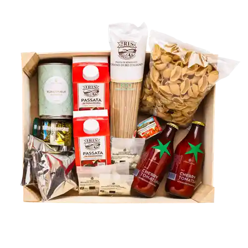 Brug kassens tomatbaserede varer til hurtige pastaretter, smagfulde saucer, fyldige supper og hjertevarme gryderetter. Tilføj en silkeblød, cremet konsistens til dine asiatiske retter med kokosmælk og skab middelhavsstemning ved dit tapasbord med oliven og pesto. Kassen inkluderer også store pastaskaller og den helt klassisk spaghetti ideel til carbonara eller bolognese.