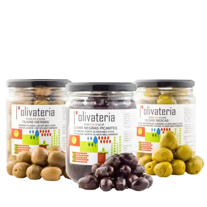 Gaveæske med økologiske oliven fra L’Olivateria A. Redondo, 3 glas a 435 g.