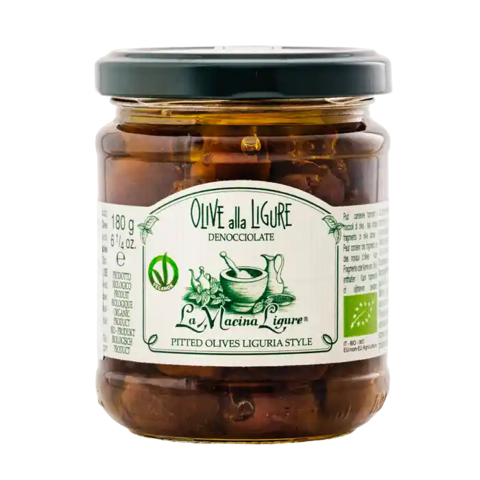 Solmodne, økologiske oliven fra Ligurien, uden sten og lagt i koldpresset ekstra jomfru olivenolie. De har en blød, afrundet smag og en naturlig salthed, der gør dem perfekte til tapas, i salater eller som et lille snackøjeblik med et stykke godt brød.