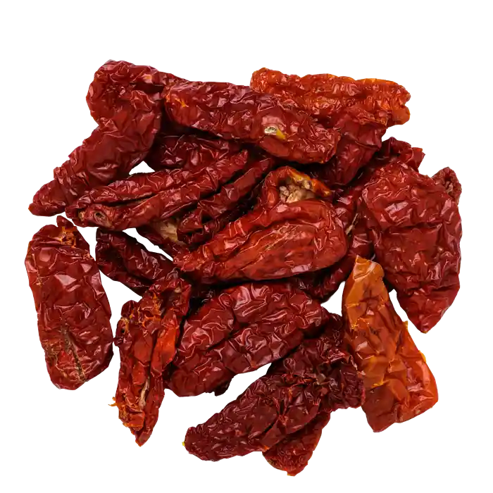 Umamifyldte, søde soltørrede tomater, produceret i Italien. Bemærk, at tomaterne er helt tørrede (ikke 'semi-dried') og pakket i pose, og kan opbevares ved stuetemperatur.