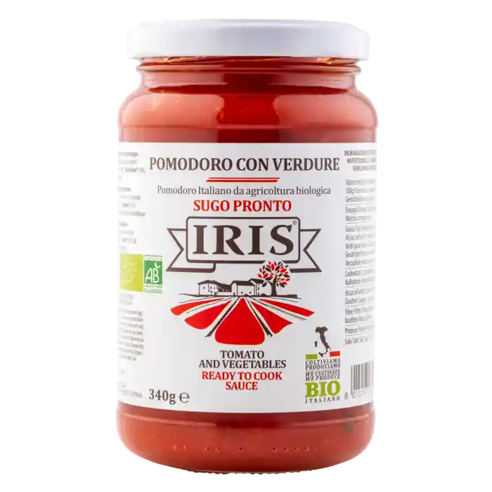 Tomaterne fra Iris har smagen af Cremona-regionens gode klima- og jordforhold. Tomaterne er forarbejdet rå og ikke tilsat sukker. Økologiske gulerødder, løg og selleri er tilsat for en fyldigere smag og så lidt frisk basilikum og havsalt. Produktet er pasteuriseret.