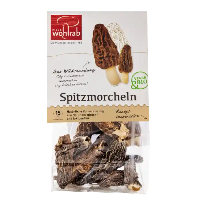 Tørrede spidsmorkler – en af skovens mest eftertragtede forårssvampe. Med sin karakteristiske kegleformede hat og dybe, nøddeagtige aroma giver spidsmorklen en særlig fylde og duft til maden. Den vokser vildt i løvskove og er elsket for sin delikate smag, som virkelig folder sig ud, når den får lidt smør, fløde eller vin at arbejde med.
