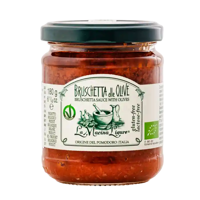italiensk bruschettasauce med modne tomater og grønne oliven, rundet af med ekstra jomfru olivenolie. Klar til brug – bare åbn glasset og nyd den friske smag af solmodne tomater og oliven.