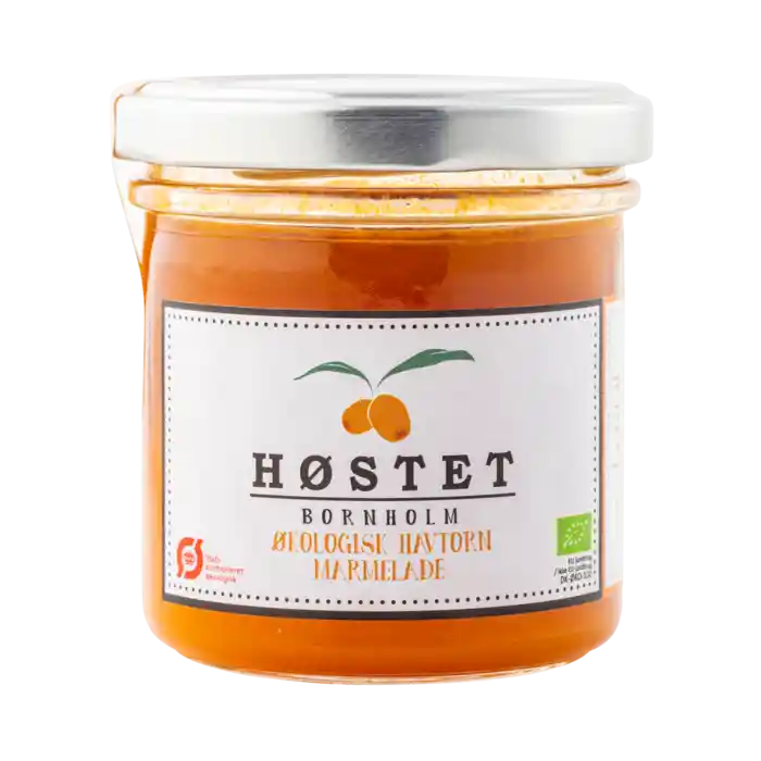 Den økologiske havtornmarmelade er ren havtorn og rørsukker samt en smule pektin, som er et naturligt stivelsesmiddel. Den er cremet og let syrlig med masser af smag.