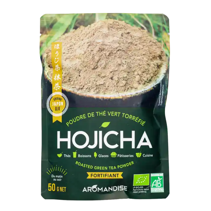 Økologisk Hojicha grøn te pulver fra Aromandise, 50 g.