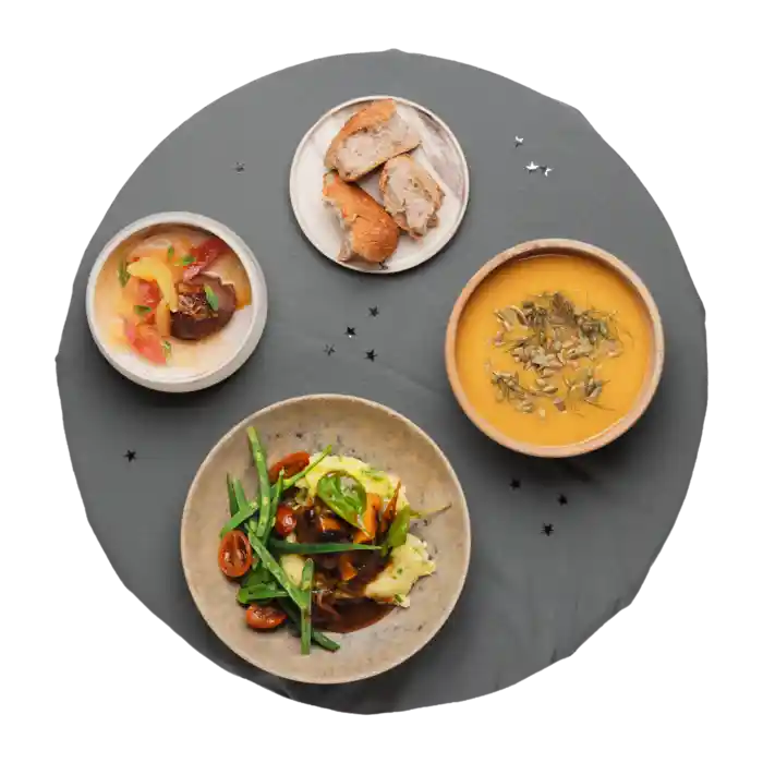 Festmenu med tre elegante og velsmagende plantebaserede serveringer komponeret af vores kokke.
