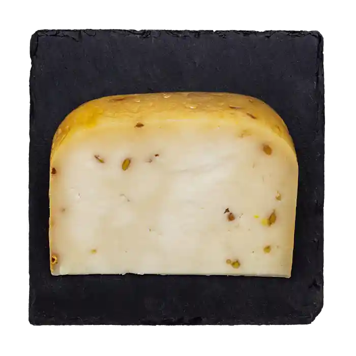 Økologisk gedegouda med bukkehornsfrø fra Nørgaards Gedemejeri, 200 g.