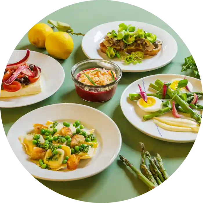 Menuen byder på fem grønne anretninger, der kan serveres hver for sig, eller nydes alle på én gang, som del af det helt store vegetariske påskebord. Hver servering tager udgangspunkt i sæsonens bedste råvarer og de traditioner, vi forbinder med påsken.