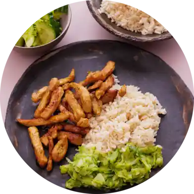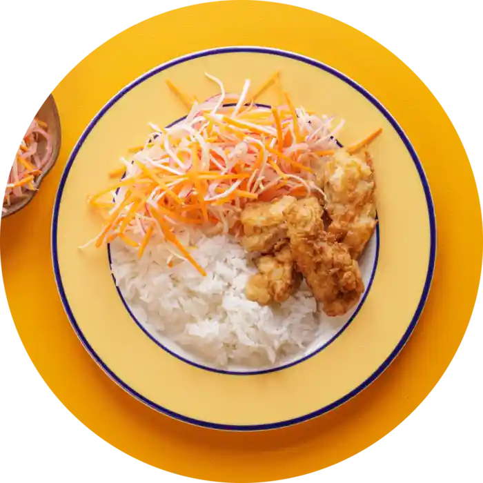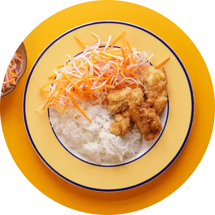 I denne måltidspose får du opskrift og ingredienser til fried chicken med ris og coleslaw.