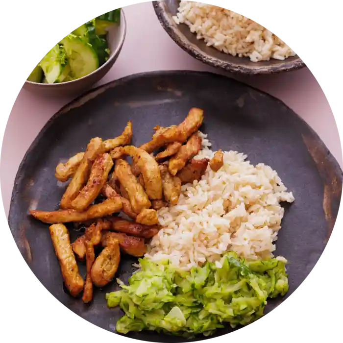 Garam masala-krydret gris serveret med dampende ris, cremet squash og frisk lime-marineret agurk. En hurtig hverdagsret med cremethed, syre og et krydret kick.