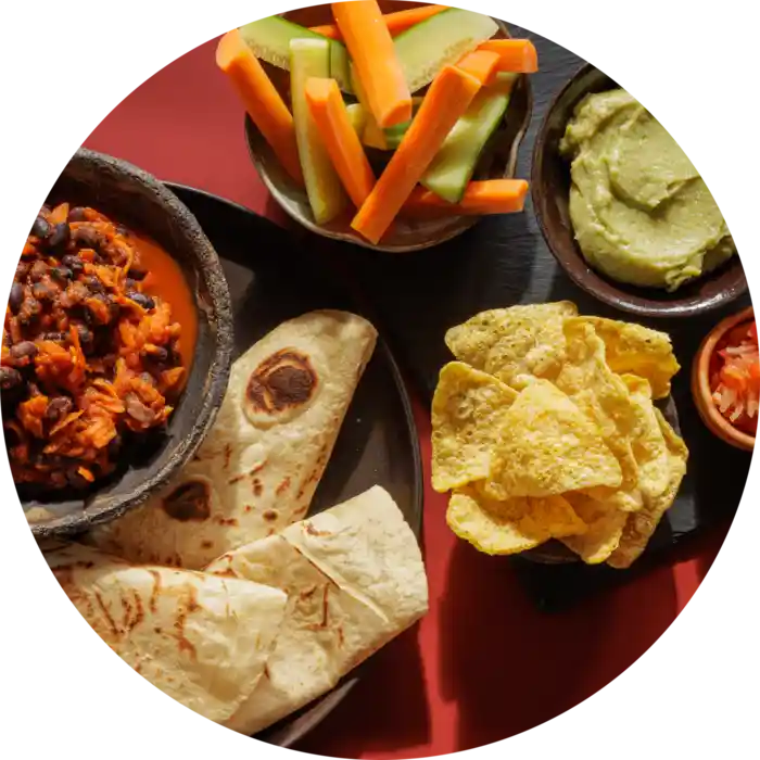 Bløde tortillas med bønnesauce og tomatsalsa. Dertil avocadodip, tortillachips og snackgrønt.