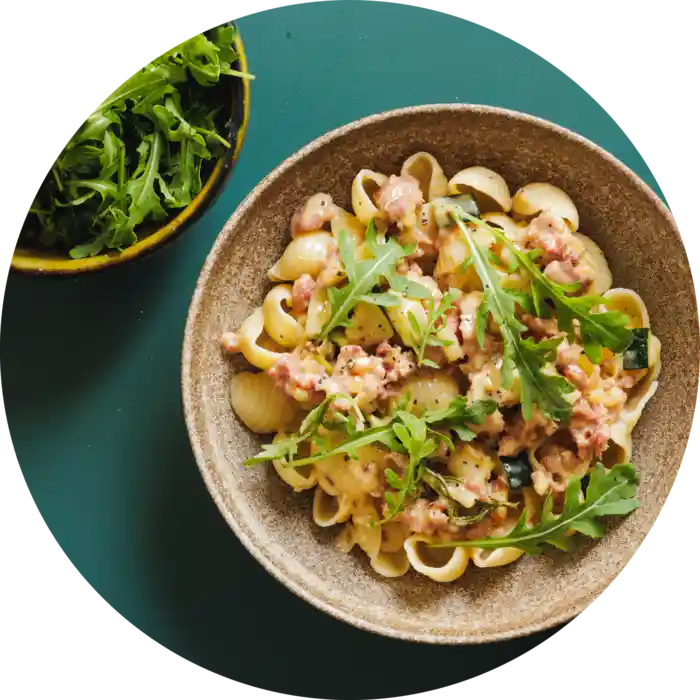 I denne måltidspose får du opskrift og ingredienser til en cremet pasta med salsiccia-krydret gris og rucolasalat: