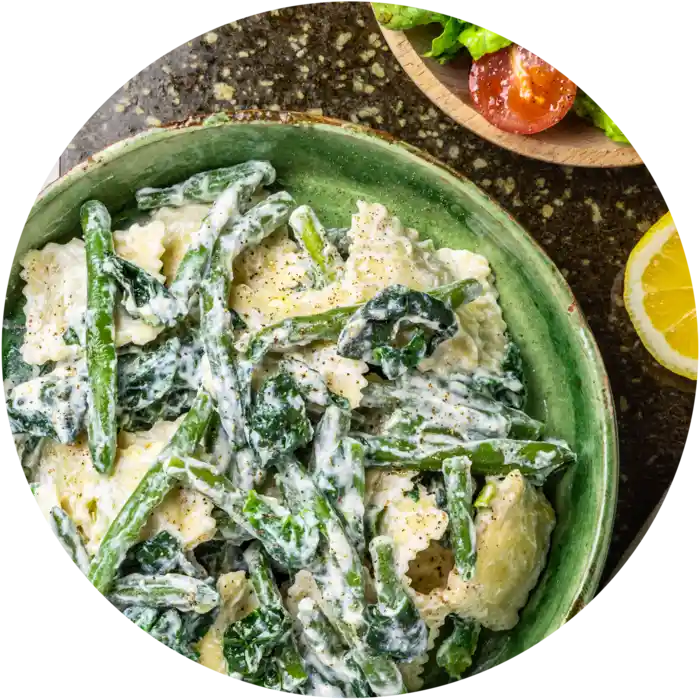 Glæd dig til fyldige ravioli med spinat og ricotta i en mild sauce, vendt med spinat og grønne bønner. Server måltidet med frisk salat med cherrytomater. En hurtig, grøn hverdagsret, som hele familien kan være med på.