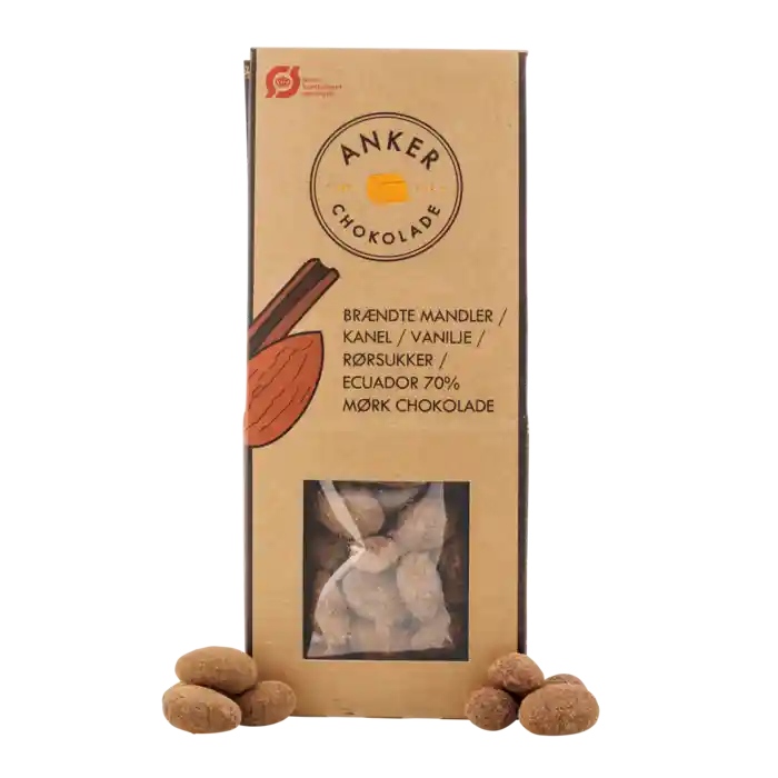 Økologiske brændte mandler med chokolade fra Anker Chokolade, 105 g.