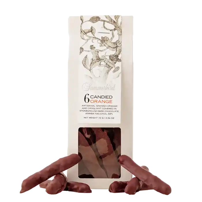 Kandiseret skal af solmodne økologiske appelsiner fra Spanien, overtrukket med et tykt lag mørk chokolade Arriba Nacional 68 % og knust karamel.