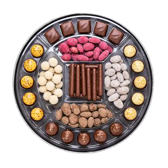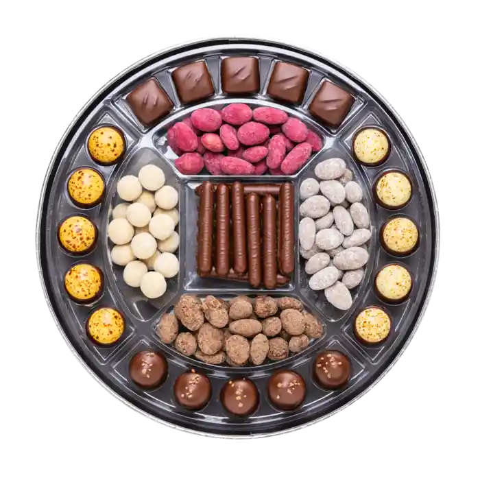 Æsken byder på marcipan lavet på stenvalsede middelhavsmandler, dragerede hasselnødder og mandler, fyldte chokolader og ren mørk chokolade. Skabt til den søde tand og velegnet som en fin lille gave.