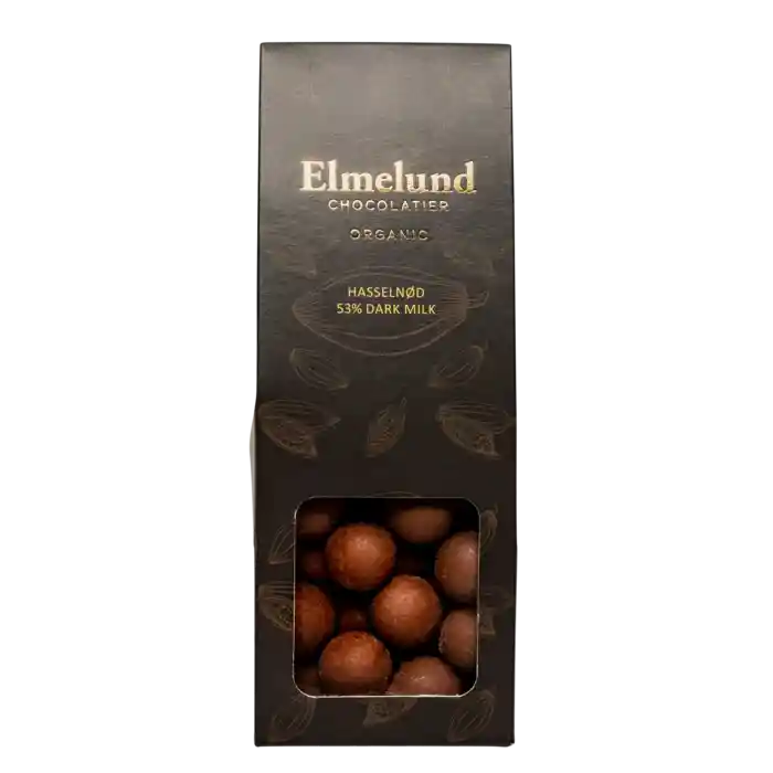 Nødderne er overtrukket med Økoladens 'dark milk'-chokolade. Den simple kombination af sprød hasselnød og den mørke mælkechokolade giver en ren og lækker smagsoplevelse.