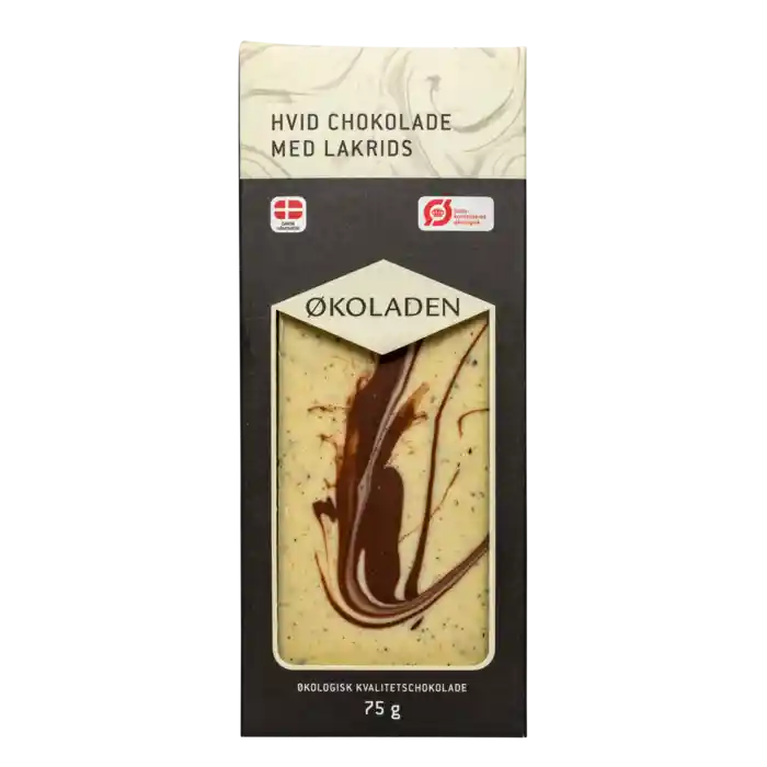 75 g | Hvid chokolade med knust rålakrids fra Økoladen