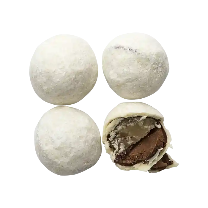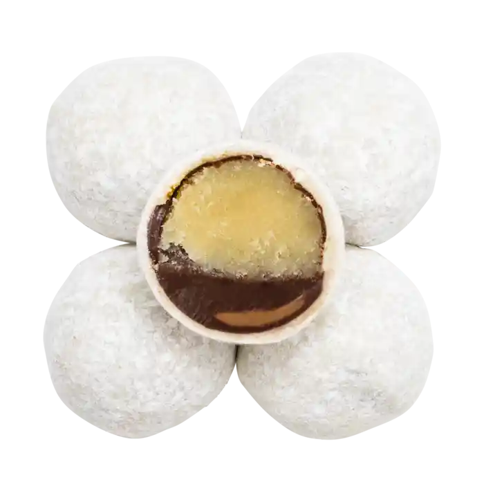 Den perfekte konstellation imellem chokolade, nougat og marcipan. Først overtrukket med mørk chokolade 61 % fra Peru, herefter hvid chokolade 36 % og afslutningsvis vendt i snehvid florsukker.