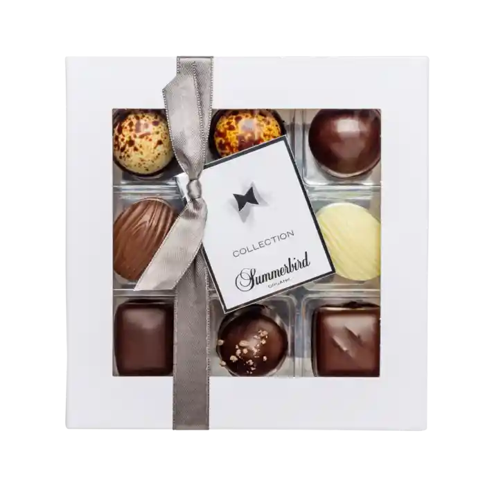 En fin gaveæske med 9 varianter af Summerbirds fyldte chokolader.