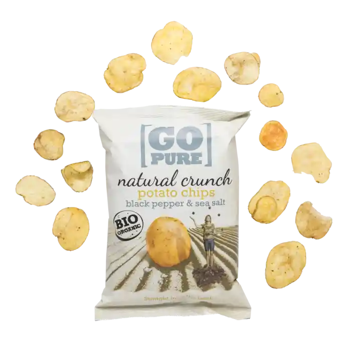 Økologiske kartoffelchips med sort peber og havsalt fra GoPure, 125 g.