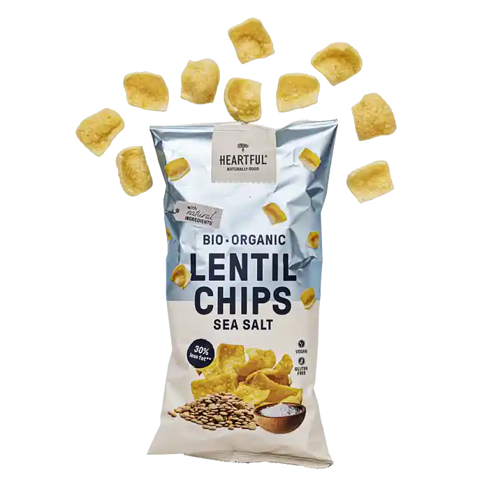 Sprøde chips lavet af linser, med en ren smag af havsalt. De er veganske og glutenfri – et velsmagende alternativ til de klassiske chips.
