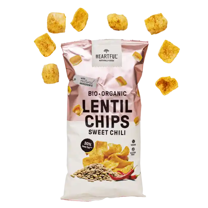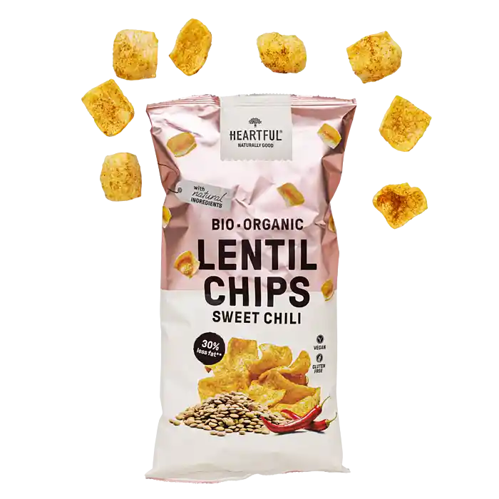Krydrede chips lavet af økologiske linser og med smag af sweet chili. De er veganske og glutenfri – et sprødt og velsmagende alternativ til de klassiske chips.