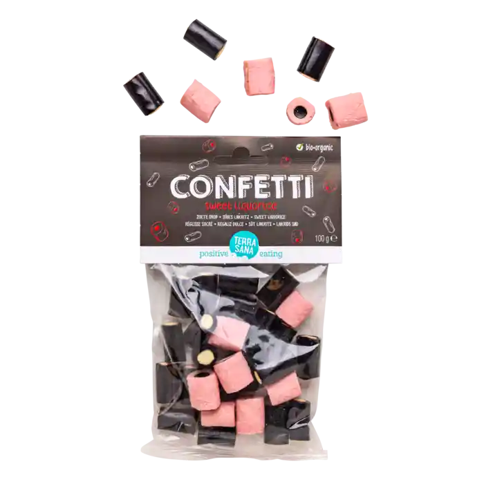 Økologisk sød lakrids-confetti fra TerraSana, 100 g.