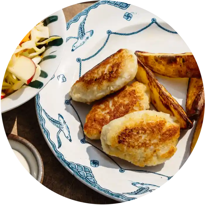 Skær kartoflerne til fritter og bag dem sprøde i ovnen. Imens varmer du de færdiglavede fiskefrikadeller – enten i ovnen eller på panden – og serverer dem sammen med en frisk salat af spidskål, gulerod, æble og yoghurt.